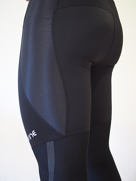 這款壓縮長褲設計之風格相當簡約,除了左大腿上的logo之外,其餘為全然的黑色到底,以服裝的配件來說算是相當百搭。值得注意的是髕骨下緣與環繞小腿外側的灰色線條是類似貼紮的設計,用以加強固定肌群。將表面拉近,則可以清楚看到一件褲子的三種不同布料構成:膝蓋以下的網布能加強透氣性,搭配COOLMAX材質科技,用以調節體溫。臀部與腿部亦各司其職,分別有其伸縮與穩固效果。