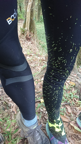 - 保護肌膚的效果。在越野跑時穿著壓縮長褲可以降低肌膚直接接觸障礙物而受傷,而與其他隊友的壓縮褲相較,BodyVine的布料材質居然很神奇地不太會沾黏上淡竹葉(戶外越野很常碰到的褲子殺手),除了回家較能方便清理褲子之外,也大大地減少肌膚被葉子刺傷的狀況。